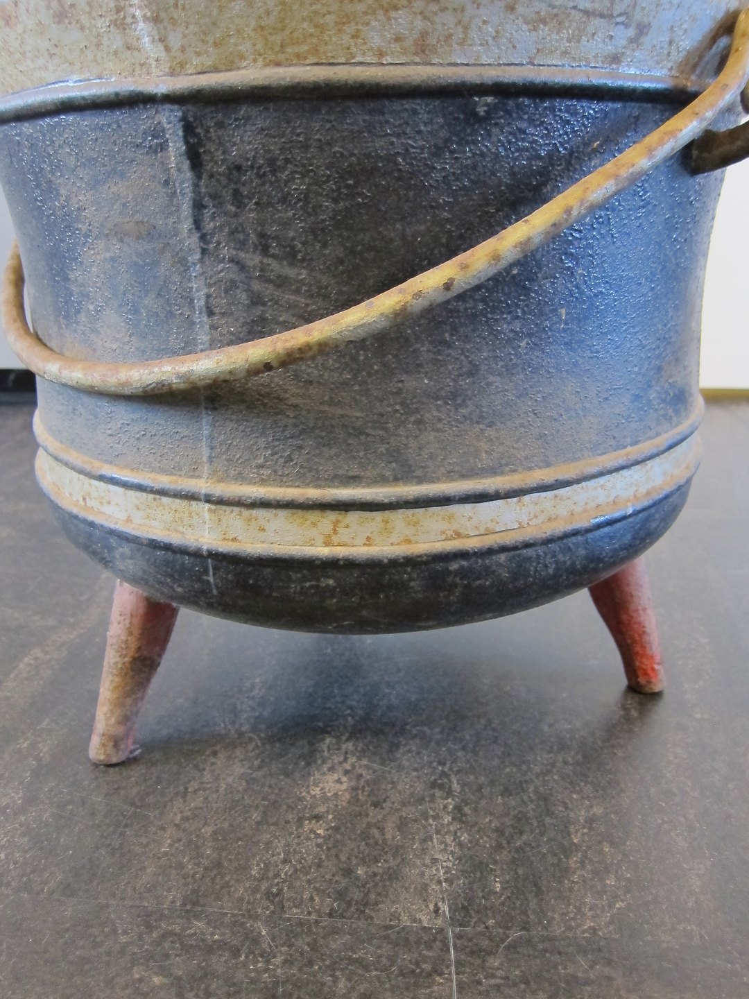 Støbejernsgryde Smuk, antik støbejernsgryde på 3 ben og med hank Fra ca 1870 H: 36,5cm, Diam: 41cm Varenr.: 31501