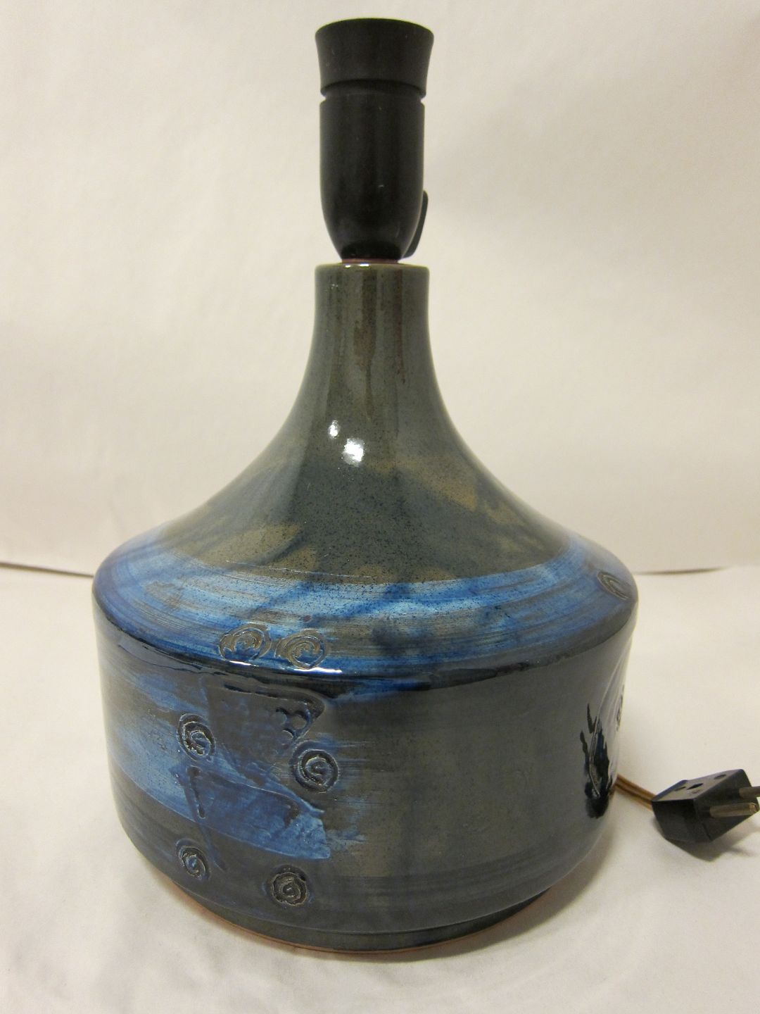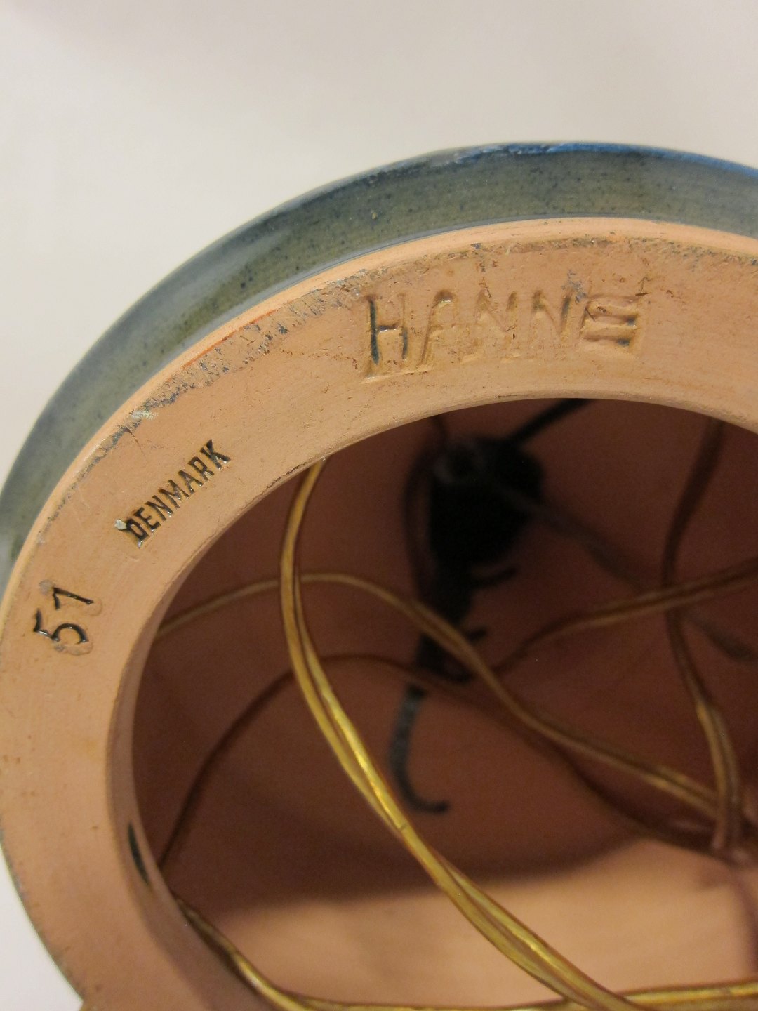 Bordlampe Blå stentøjslampe Signeret: Hanne samt 51, Denmark H: uden fatning 21cm, diam: 20cm Varenr. 41772