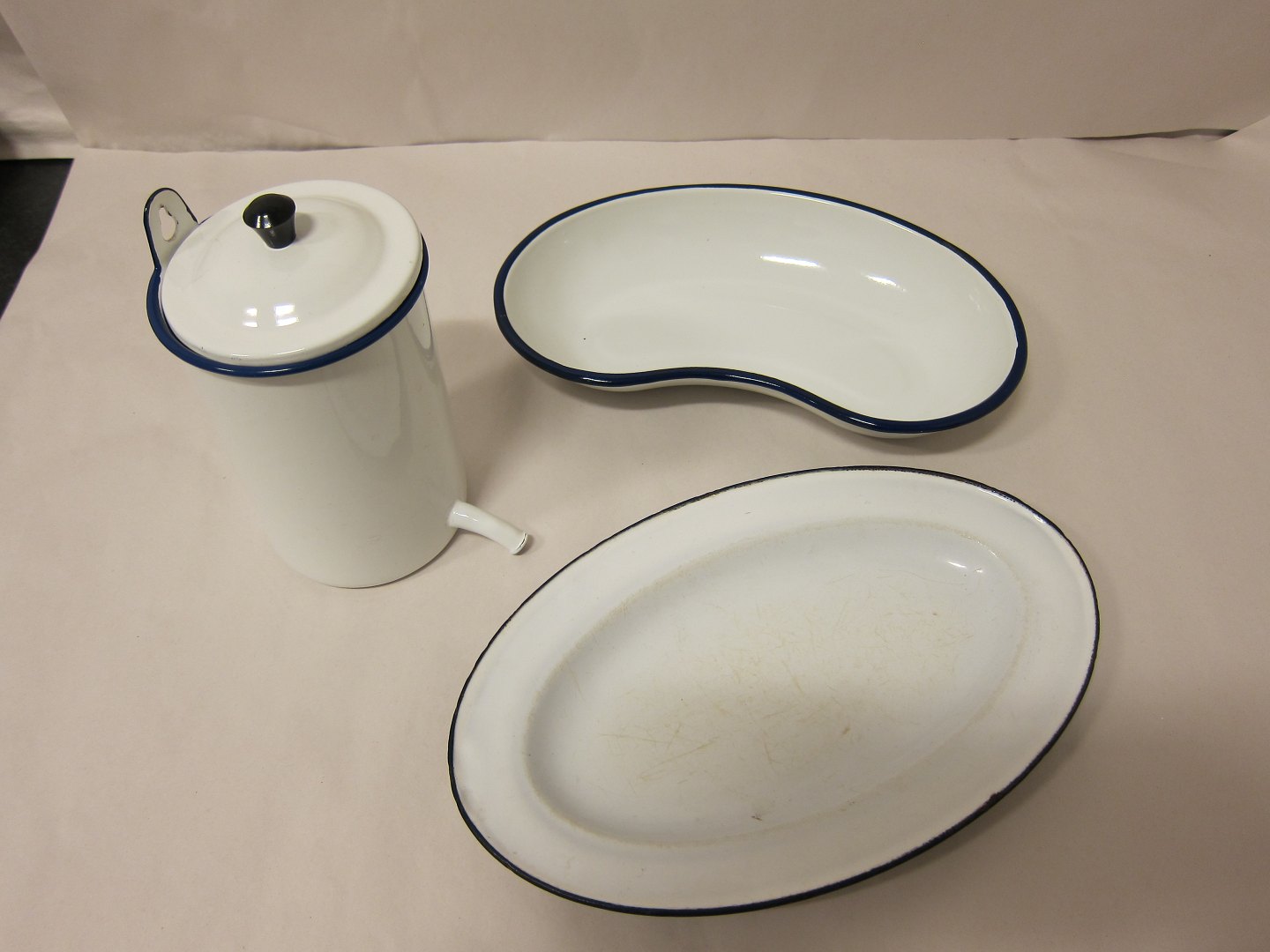 3 gamle, hvide emaljedele med blå stribe Vandbeholder, en såkaldt irrigator, med tilhørende slange og glasrør (venstre) Dkr. 125,- Fad, nyreformet (øverst midt) Dkr. Solgt Fad, ovalt (nederst højre) Dkr.: 75,- Varenr.: 51701 og 41701