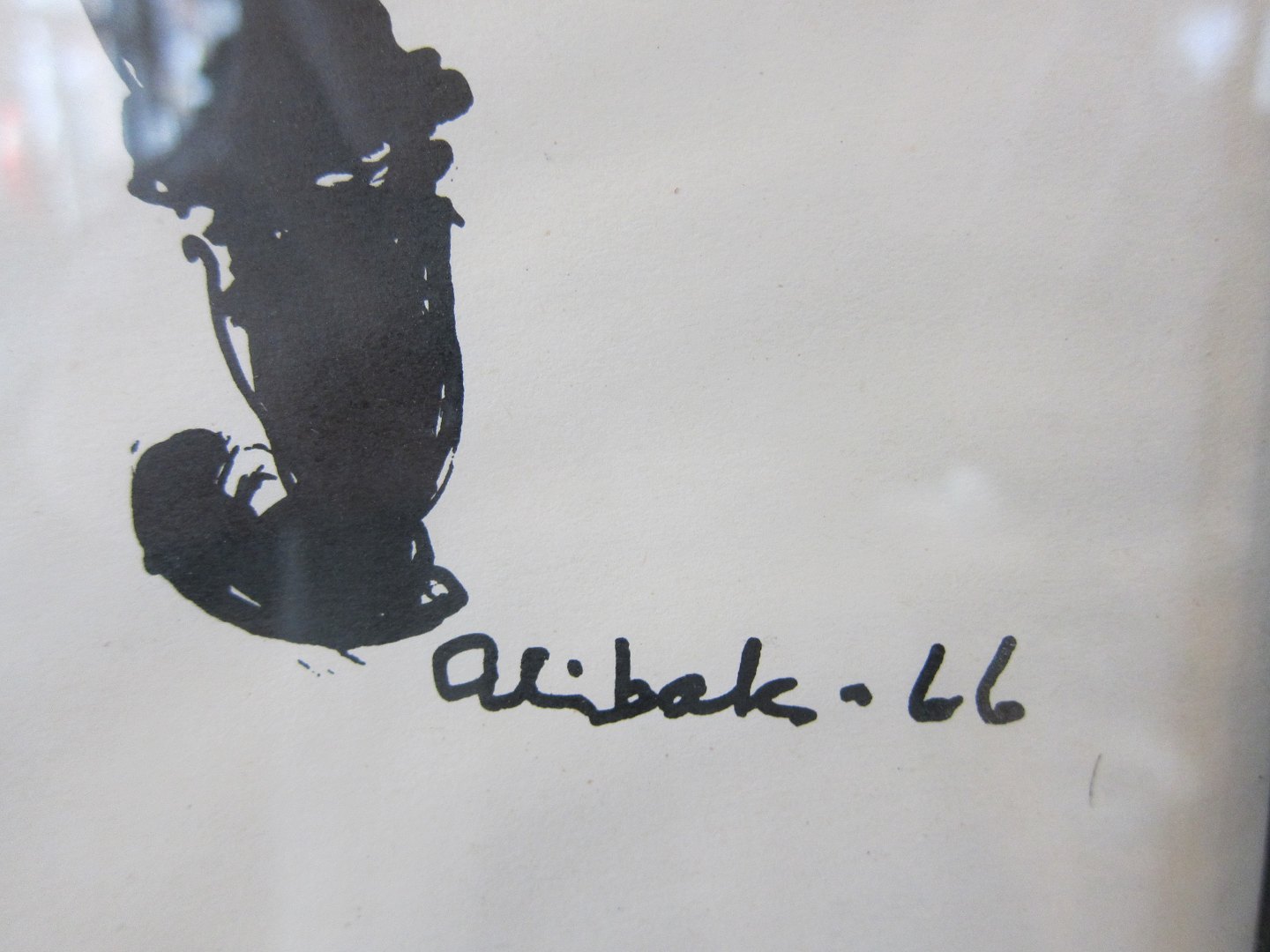 Tryk af den grønlandske kunstner, Alibak, i sort ramme Signeret: Alibak, 1966 L: 124cm, B: 32cm Bemærk: Enkelte skjolder Varenr.: 1006-4212