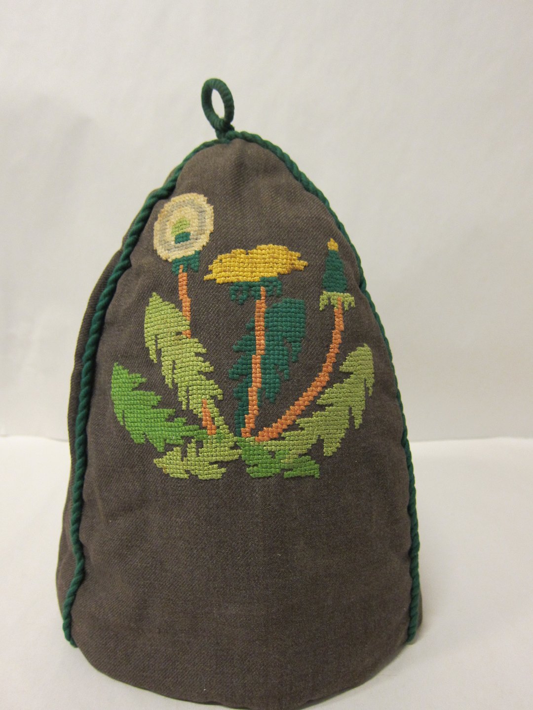 Smuk, gammel, håndbroderet tehætte med blomstermotiv
