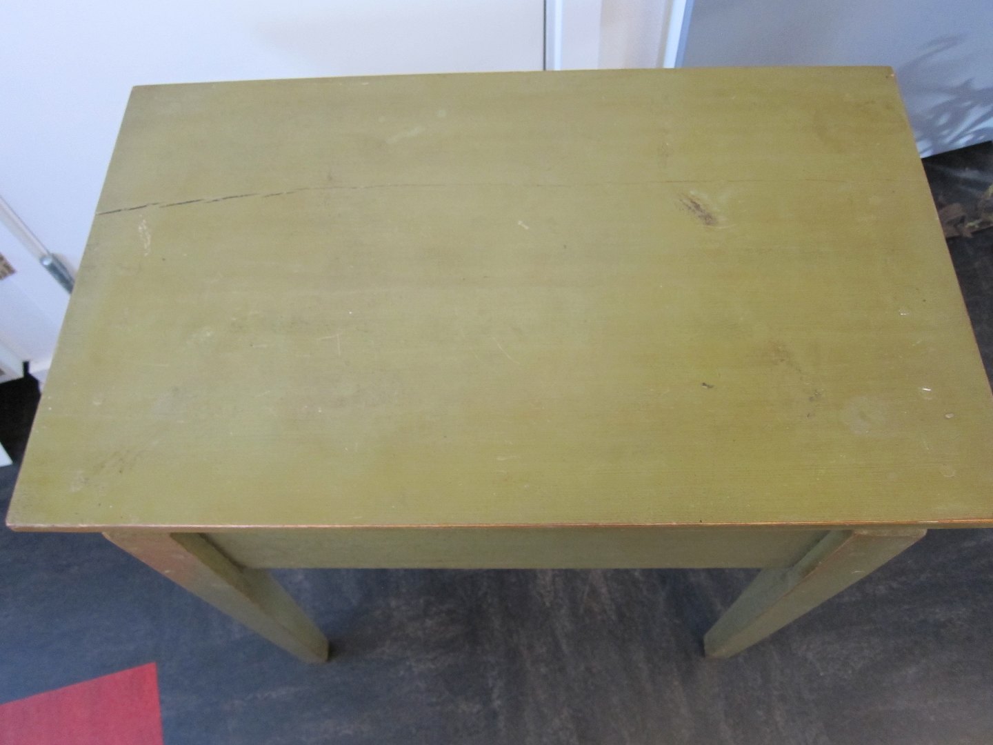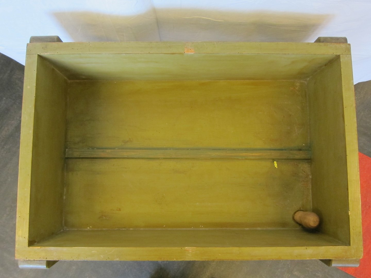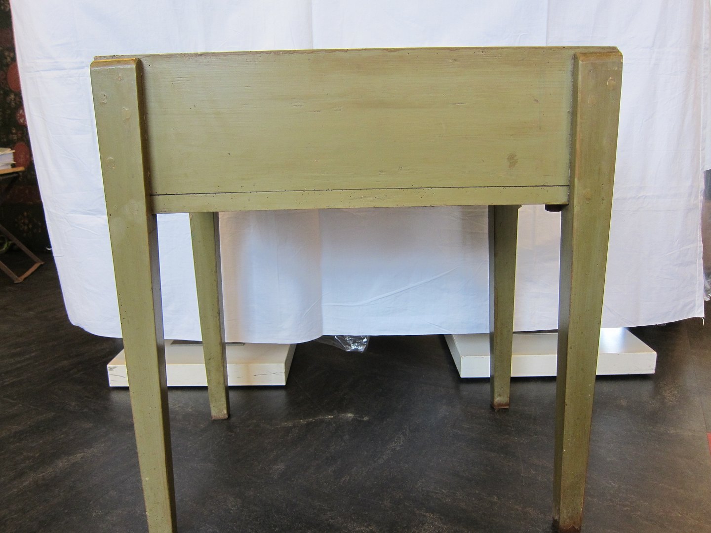 Vaskebord Antikt vaskebord med afløbshul og prop Ca. 1860 Fyrretræ, malet med gammel grøn oliemaling L: 81cm, B: 49,5cm, H: 76cm Varenr.: 1003j