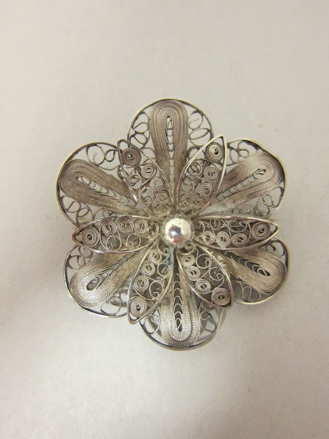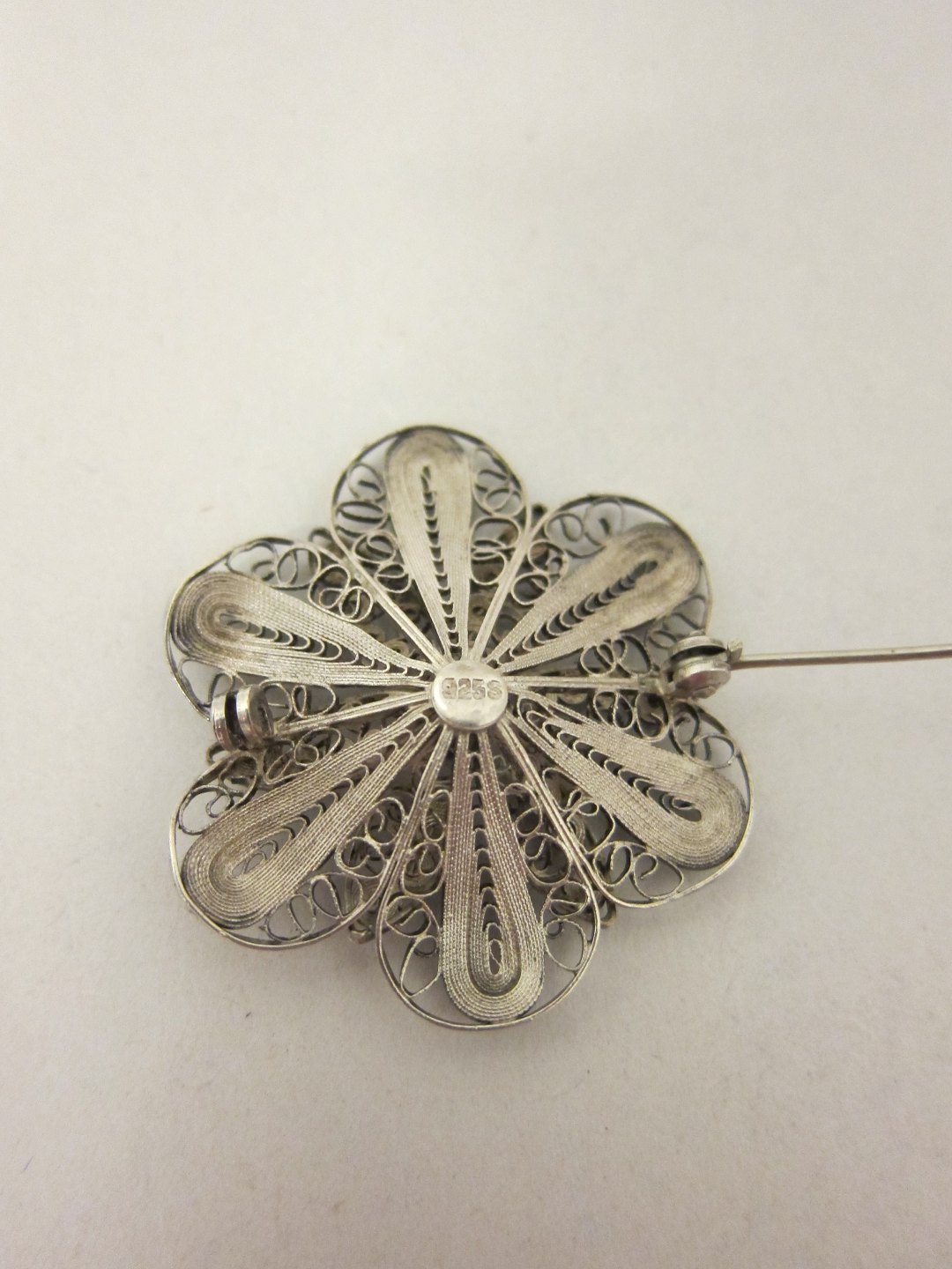 Filigran broche af sølv En let og enkel broche formet som en blomst Stemplet: 925s Diam: 4cm BEMÆRK: INTET SØLV I SHOWROOM'et - aftal tid for fremvisning Varenr.: 51911