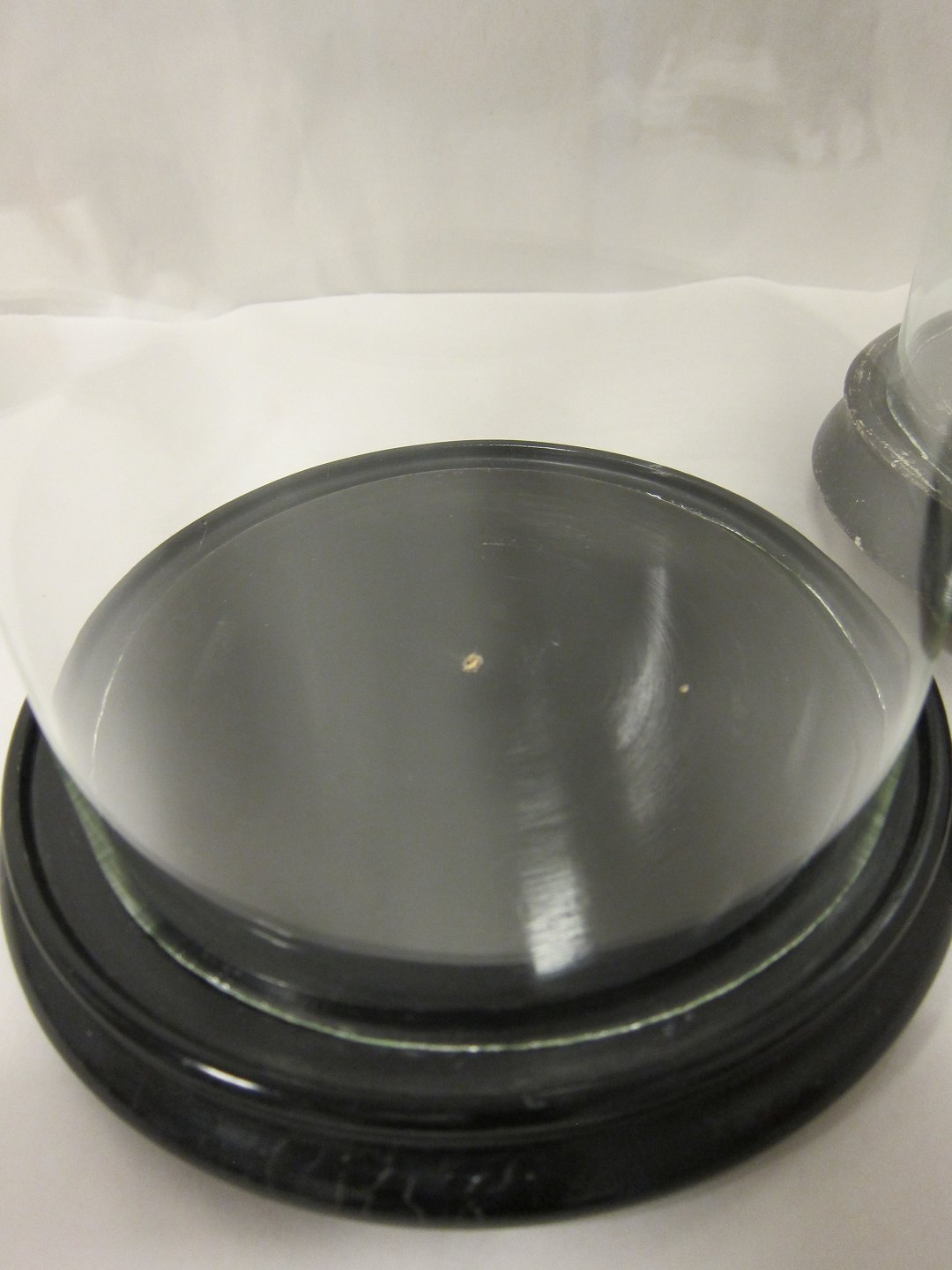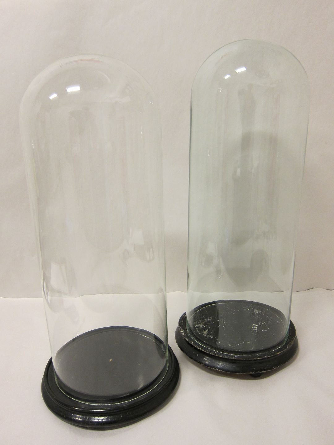 Gammel glas globe / glaskuppel på sort træfod H: 47cm I god stand Globen til højre er solgt Varenr.: 31912