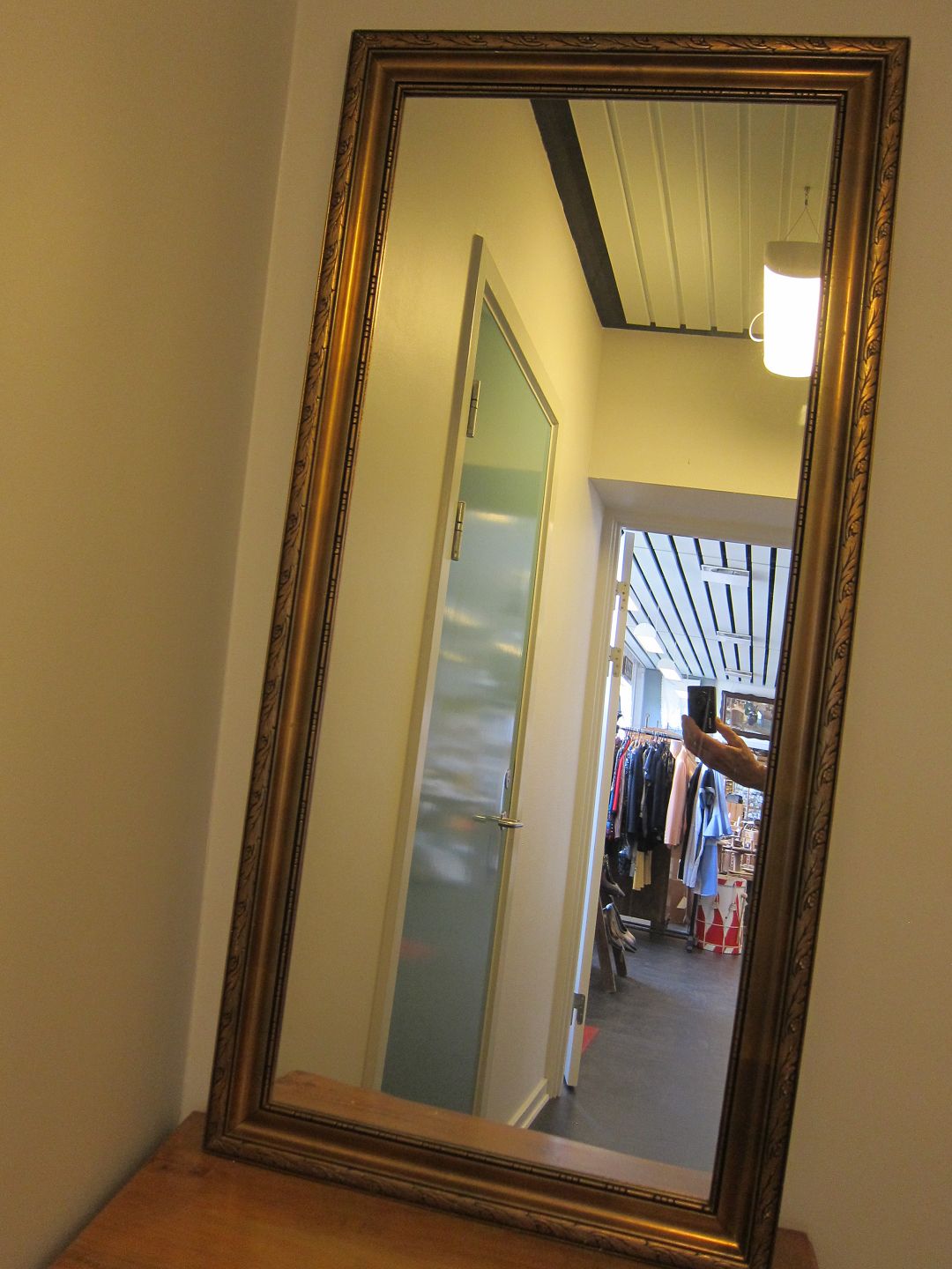 "Guldspejl" Stort figurspejl med meget smuk ramme Fra ca. 1920 H: 131cm, B: 63cm Flot stand Varenr.: 1006