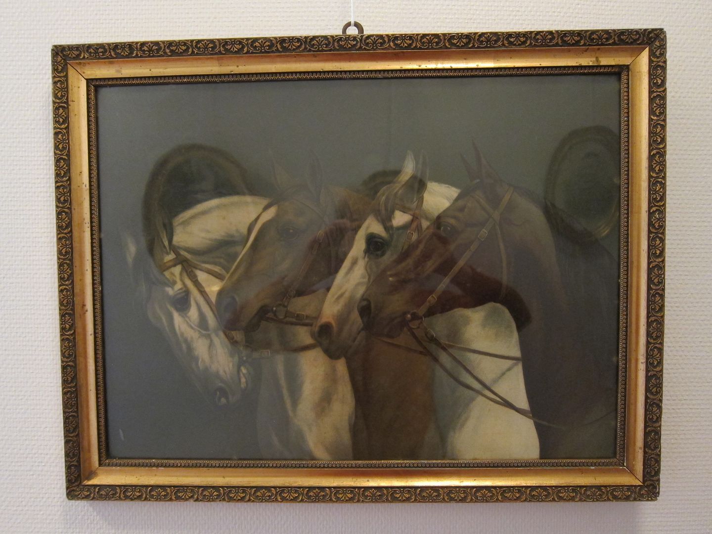 Linoleumstryk med hestemotiv Indsat i bladguldsramme Fra ca. 1920 H: 43cm B: 56,5cm Varenr.: 310182