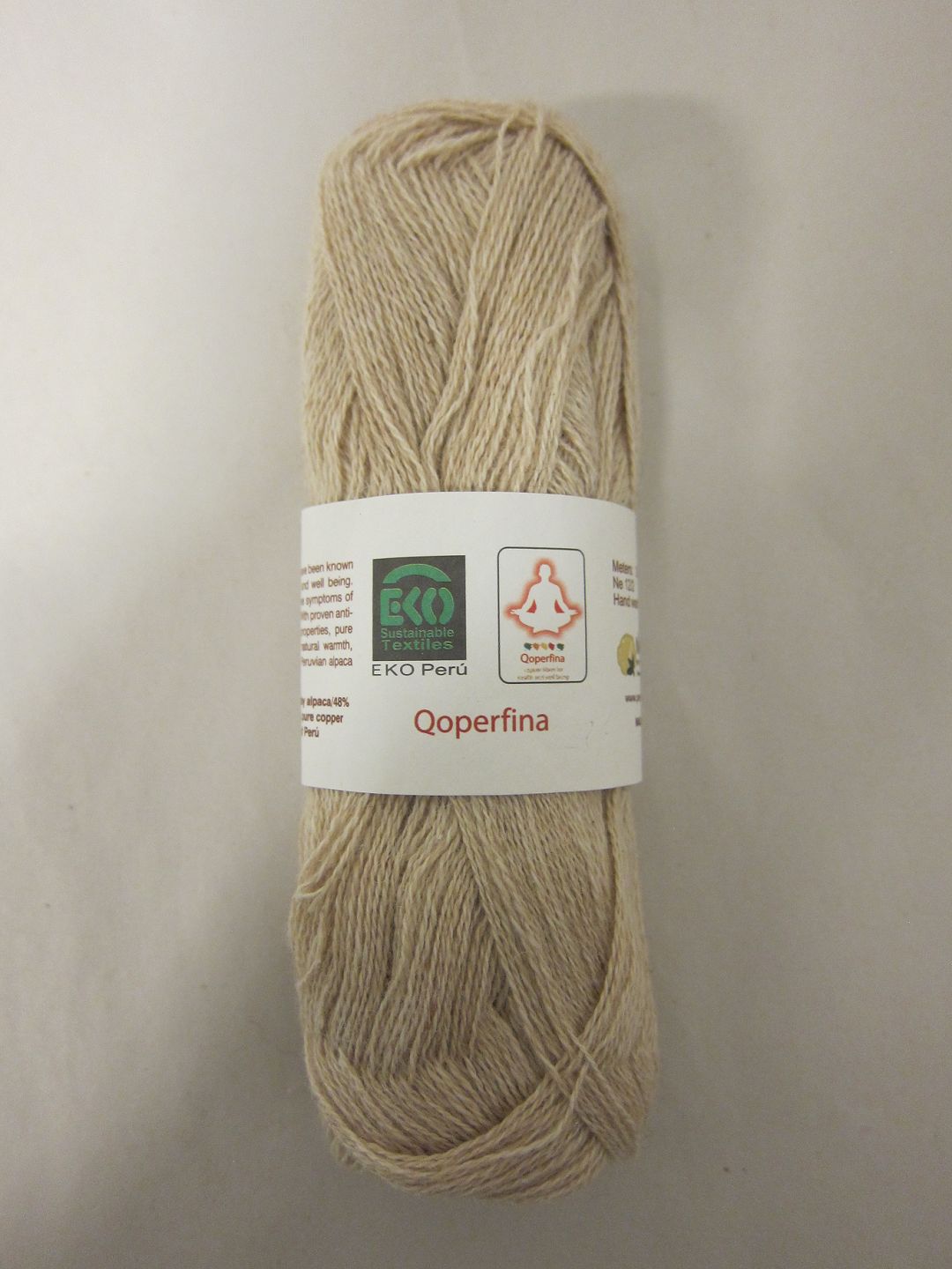 Qoperfina er et 100% naturprodukt fra Peru, som består af økologiske bomuldsfibre og alpakafibre blandet med naturlig kobber. Den særlige kombination giver et ualmindeligt blødt og slidstærkt garn.