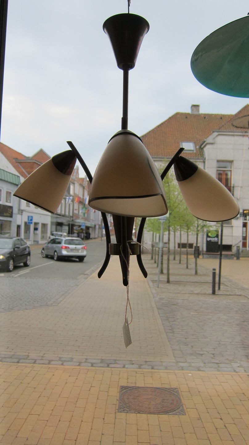 Flot retro loftlampe af træ og messing med 3 smukt formede, matterede glasskærme