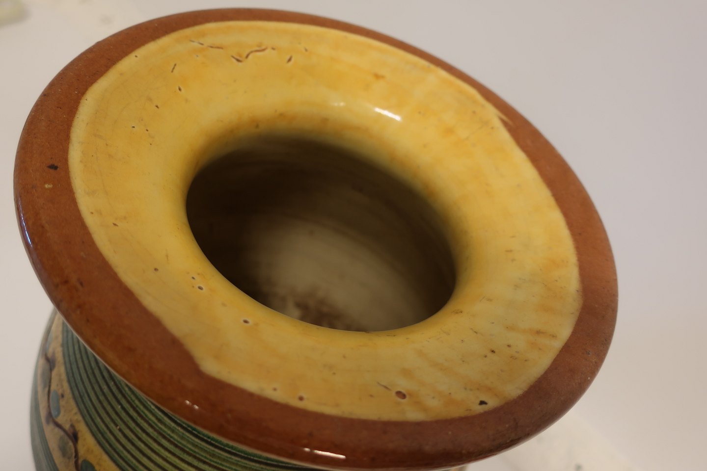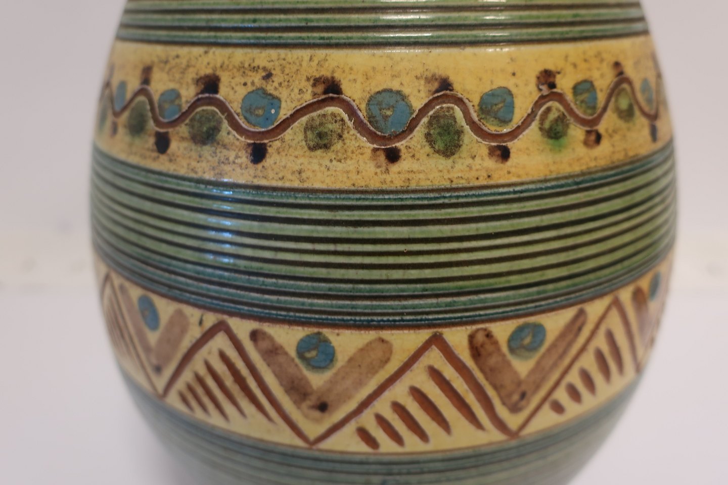 Stor gulvvase i smuk, blank glasur i afdæmpet grøn farve med gul/brun dekoration