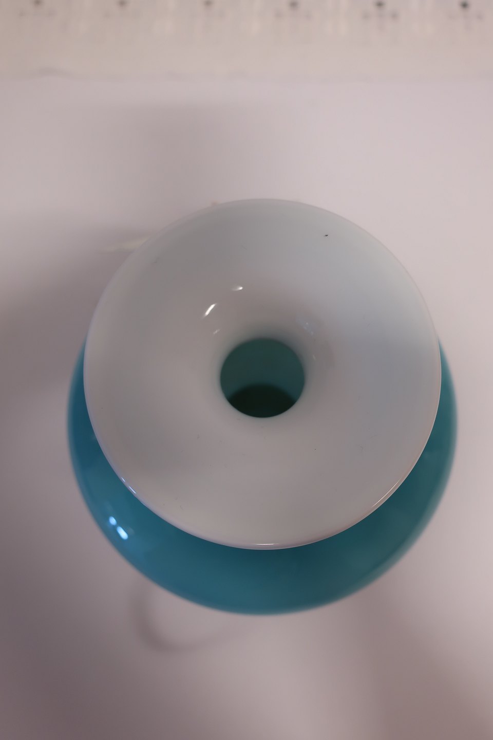 Carnaby Vase fra Holmegaard / Fyns Glasværk Turkis blå med inderside af opal hvidt glas Design: Per Lütken (1916-1998) Produceret i perioden 1968 - 1976 H: 15,4cm Flot stand Varenr.: 910113