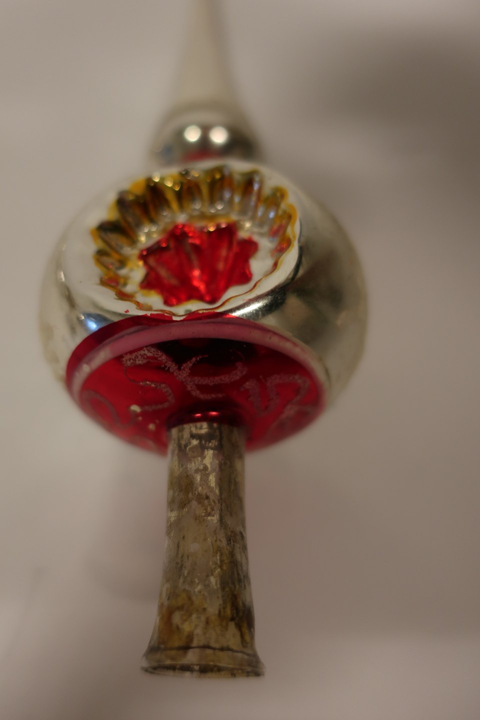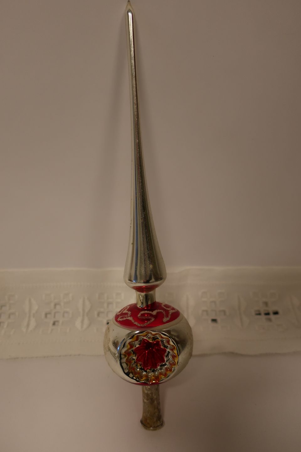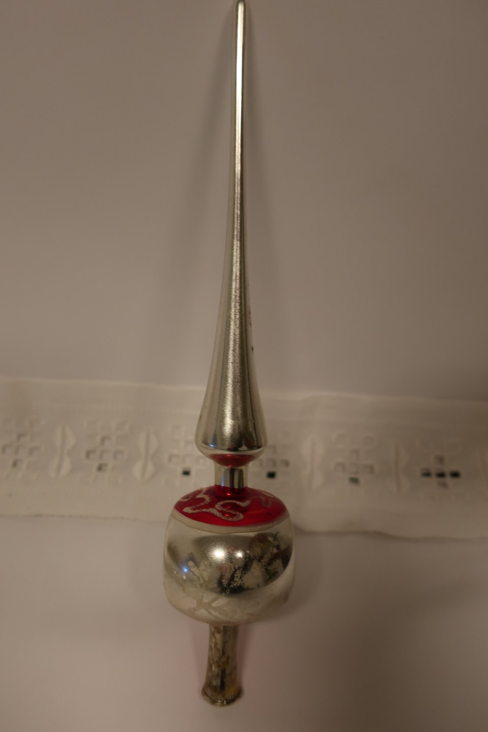 Julespir af glas Gammelt julespir med reflektor i meget smukke farver, grundfarven er sølv God stand Varenr.: 4-020112b