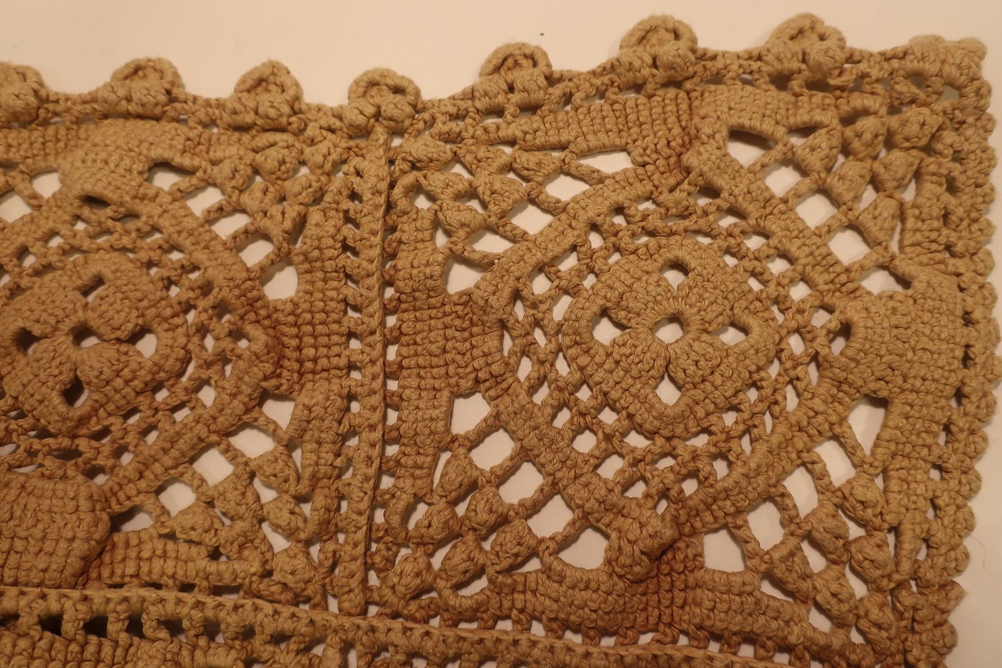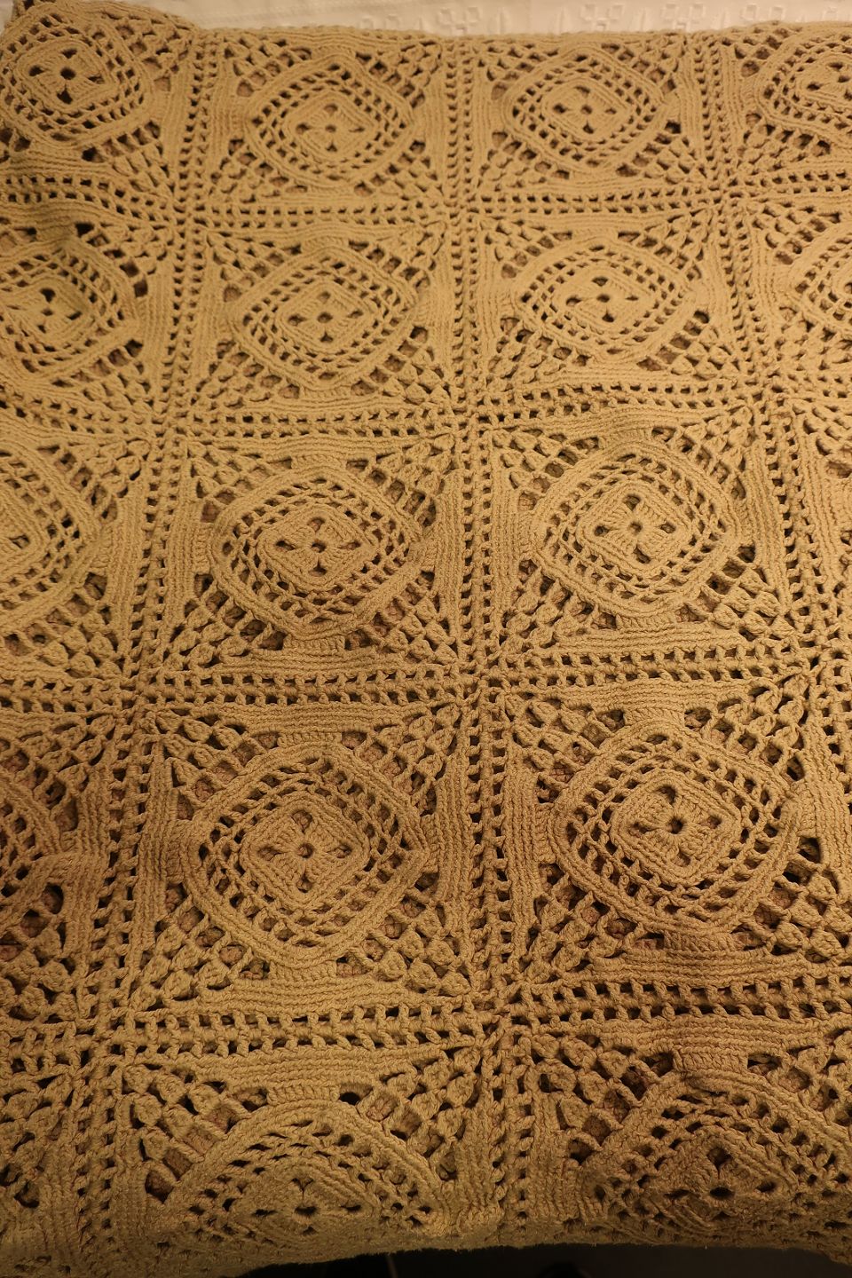 Sengetæppe håndhæklet Hæklet i et smukt utraditionelt mønster 221cm x 167cm Beigefarvet (Farve svært at gengive) God stand Varenr.: 4-4194