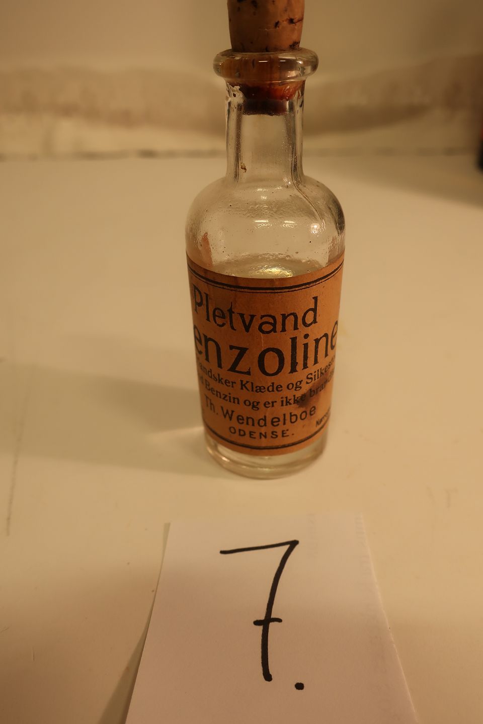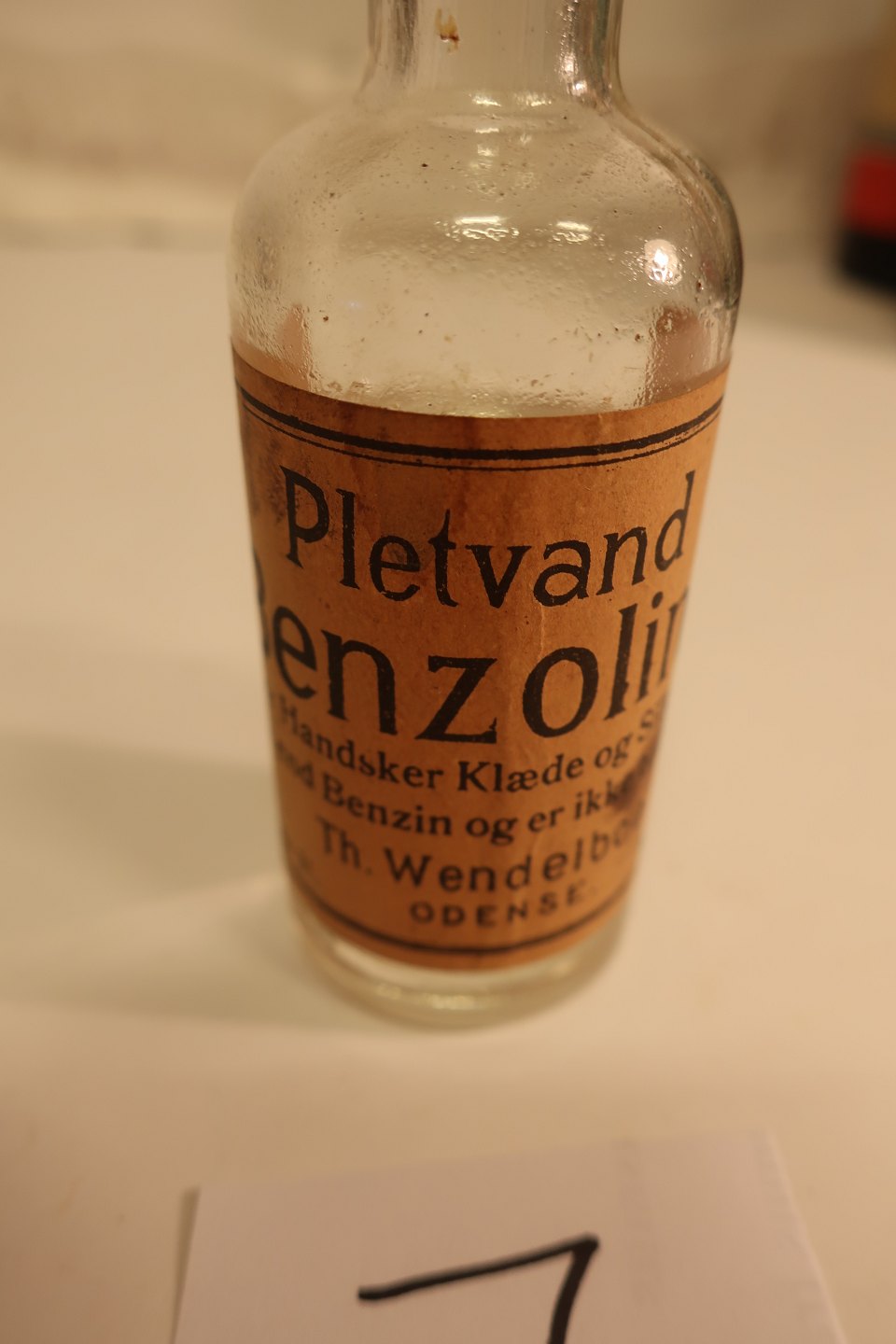Pletvand / Benzoline i gammel flaske med den originale etikette og med originalt indhold (½ fyldt)