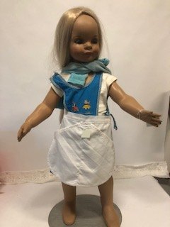 L Retro Barnemannequin / Mannequin H: 77 cm Mannequin er meget livagtig, og har et smukt langt hår Giver en evt. udstilling liv Inkl. tøj Står selv på standeren uden yderligere støttebehov Rigtig god stand Varenr.: 4-51632 + 4-41016