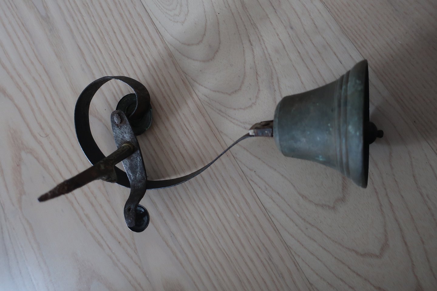 Butiks dørklokke - antik Bronce Ophæng i jern og fjederen/jern blik Fra ca. 1850 Indklusive "jernspyd" til at banke ind muren Varenr. 4-41012