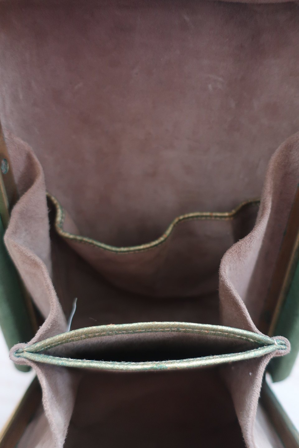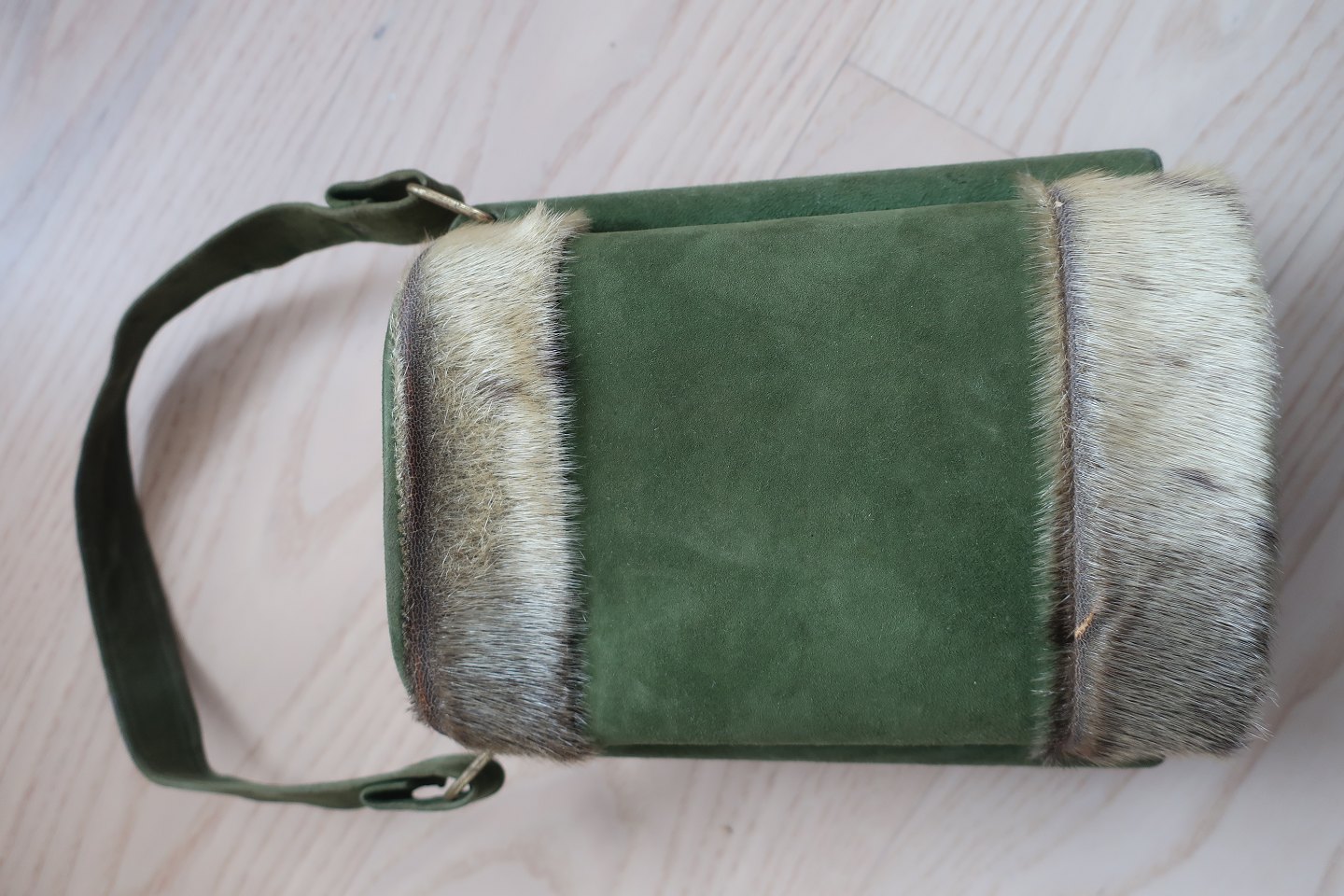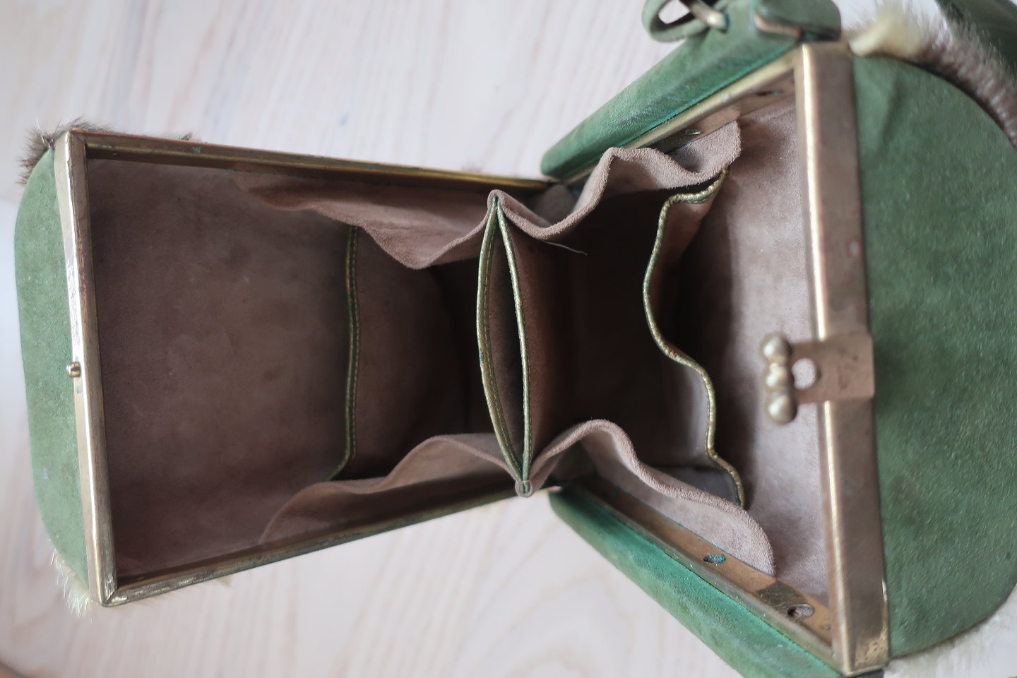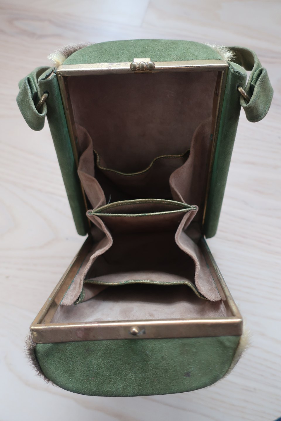 Vintage taske med skindbesætning Tasken anvendes på højkant Med rem God stand udvendig og indvendig, men med lidt slid på skindet Varenr.: 4-11162