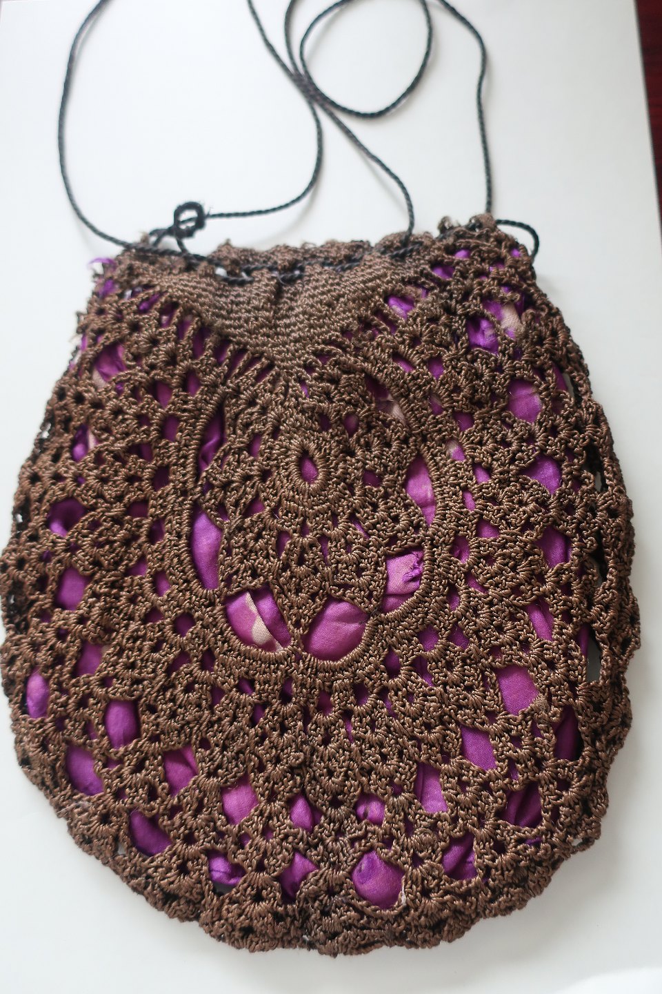 Antik smuk gammel håndhæklet håndtaske Lukning med snor Foret med stof i anden farve Fra ca. 1880-1900 Patina og slid, men ellers god stand Varenr.: L1006