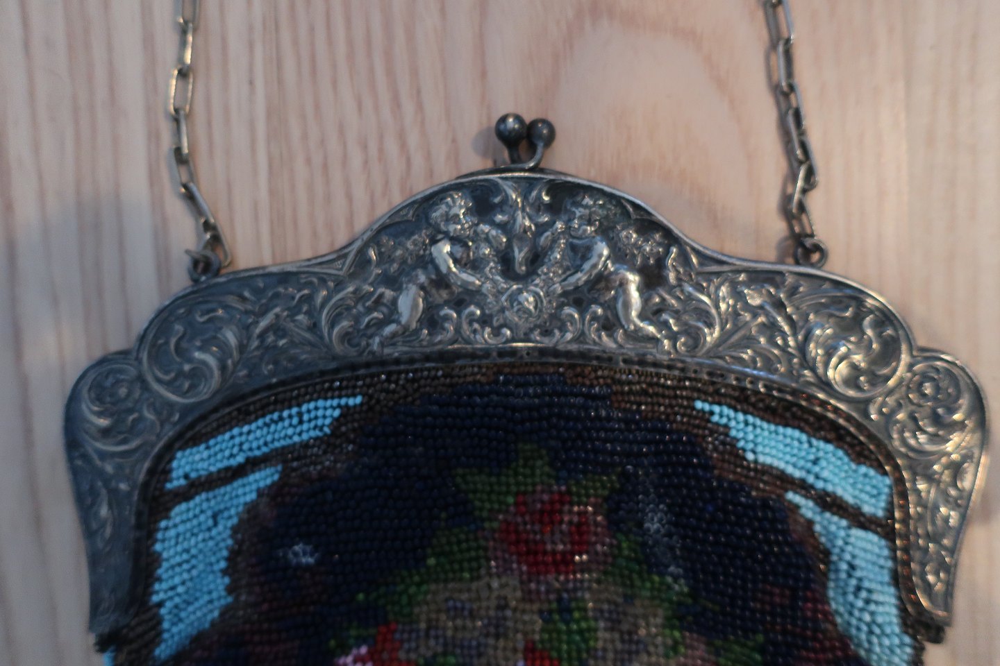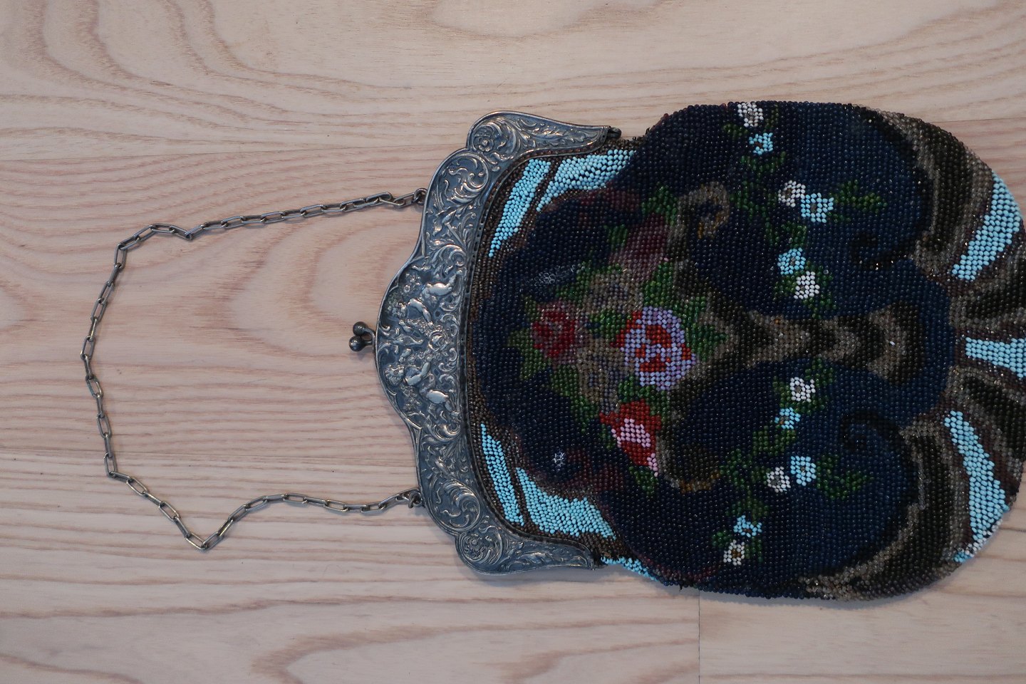 Den gamle taske fra ca. 1880 er lavet som håndlavet glasperlebroderi med smukke mønstre