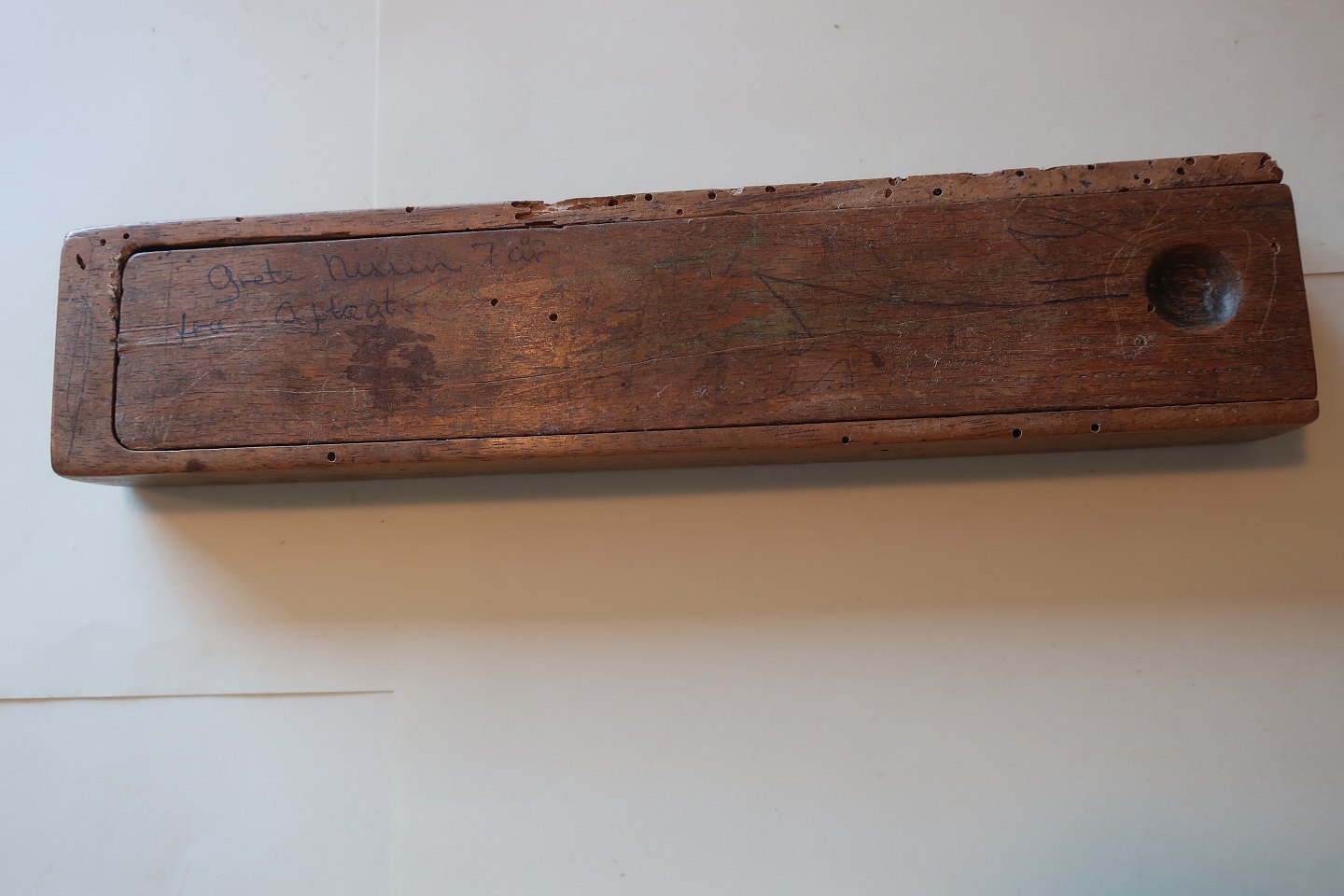 Pennalhus/pennehus af træ fra gammel tid, vi bliver helt nostalgiske Lavet af træ L: ca 23cm Varenr.: 4-41161
