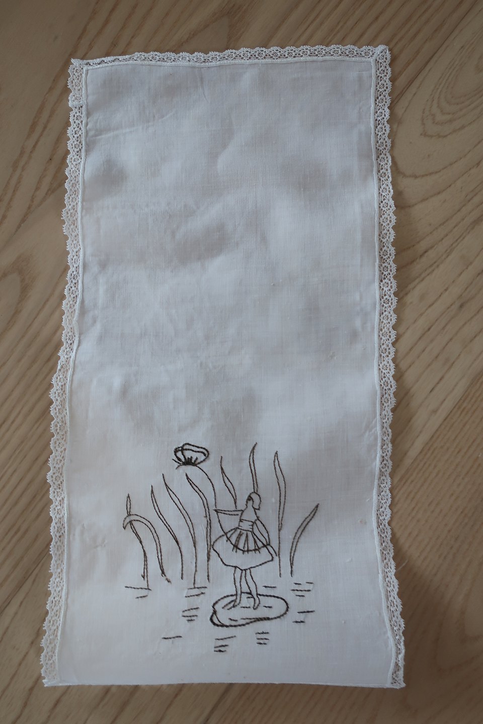 Bakkeservietten er håndbroderet, fra dengang det var helt naturligt at sidde med broderigarn og nål
