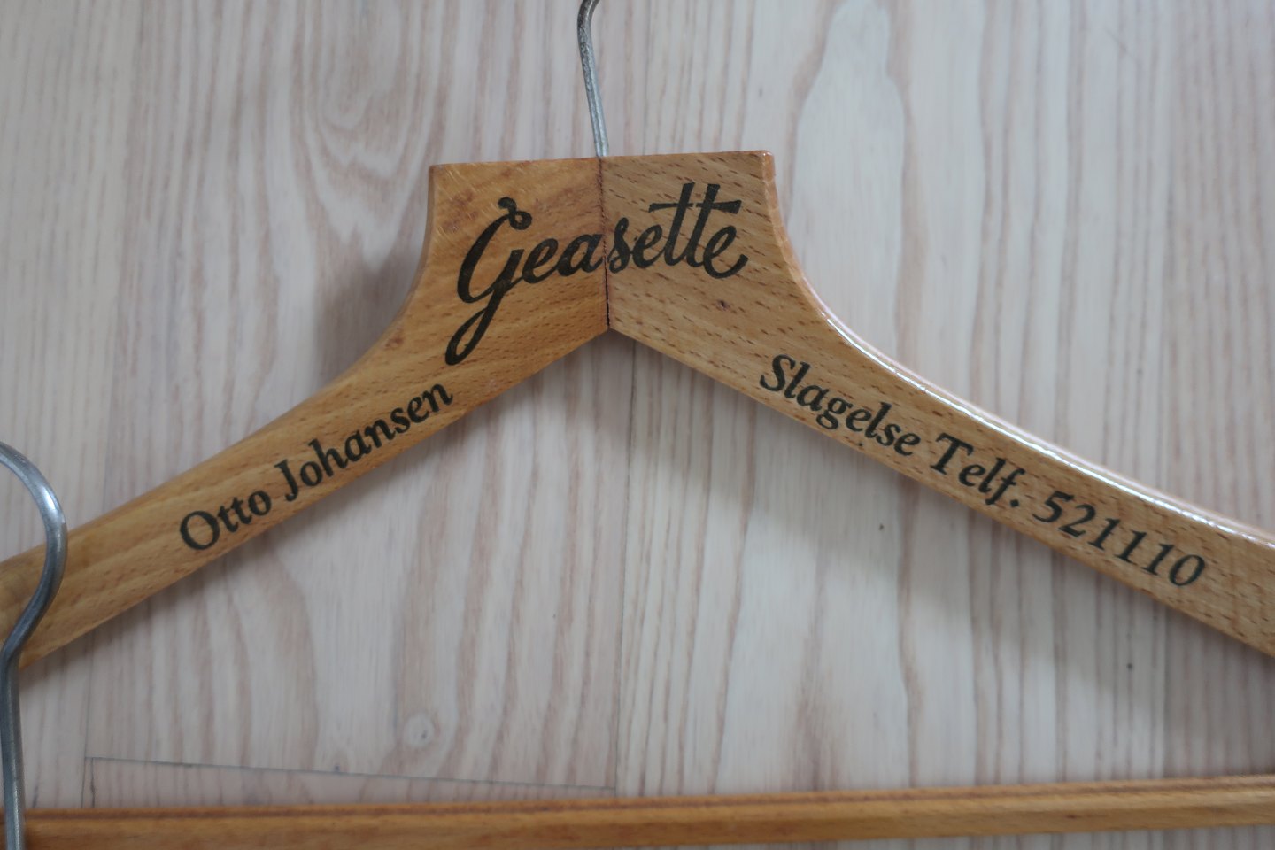 Gamle bøjler af træ Meget hyggelige og dekorative Med forskellige firmatekster/reklamer fra Christian Schmidt, Colosseum Sønderborg - aaj, godt tøj - P. Moldt Sønderborg - Geasette, Otto Johansen, Slagelse God stand Varenr.: 4-61462