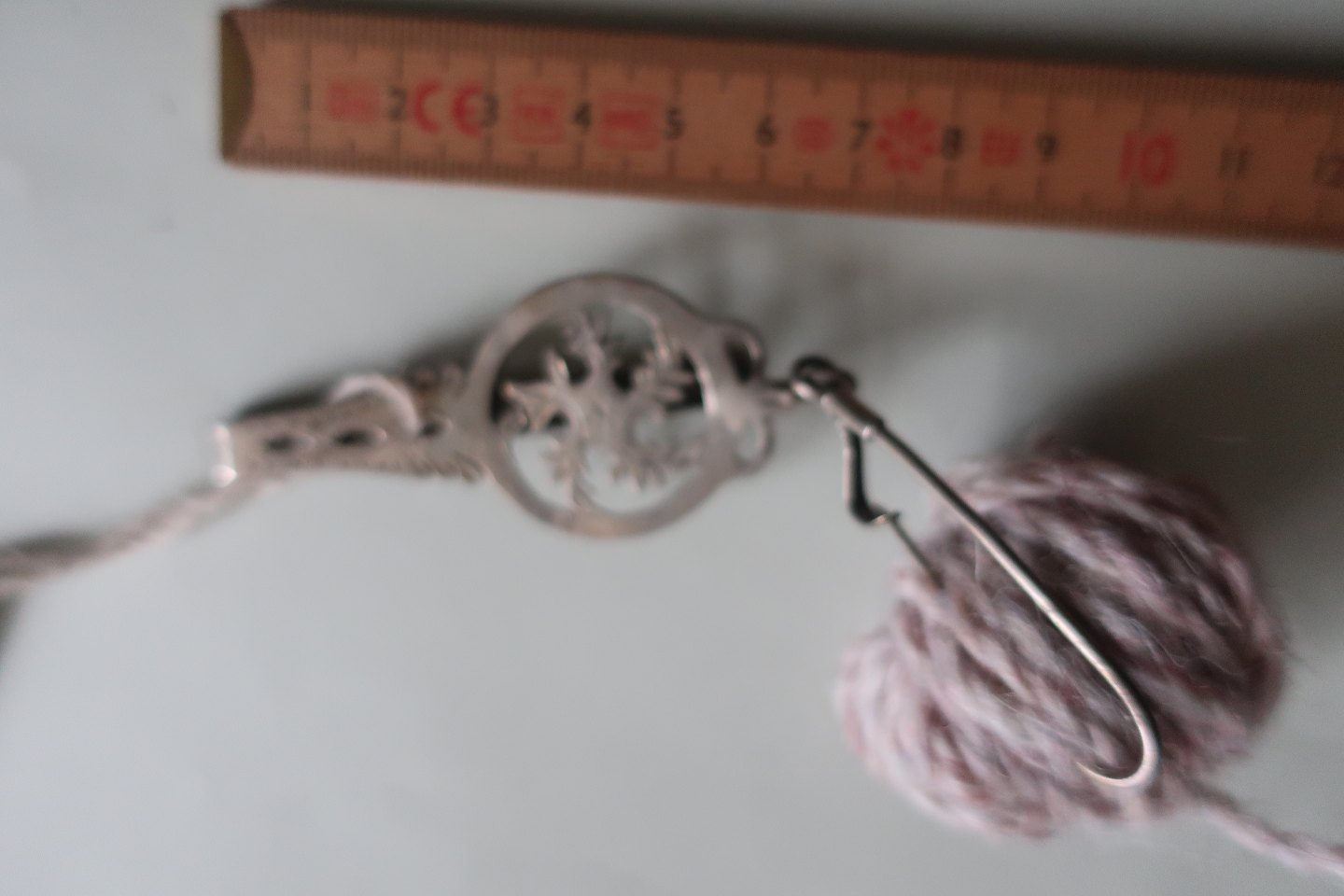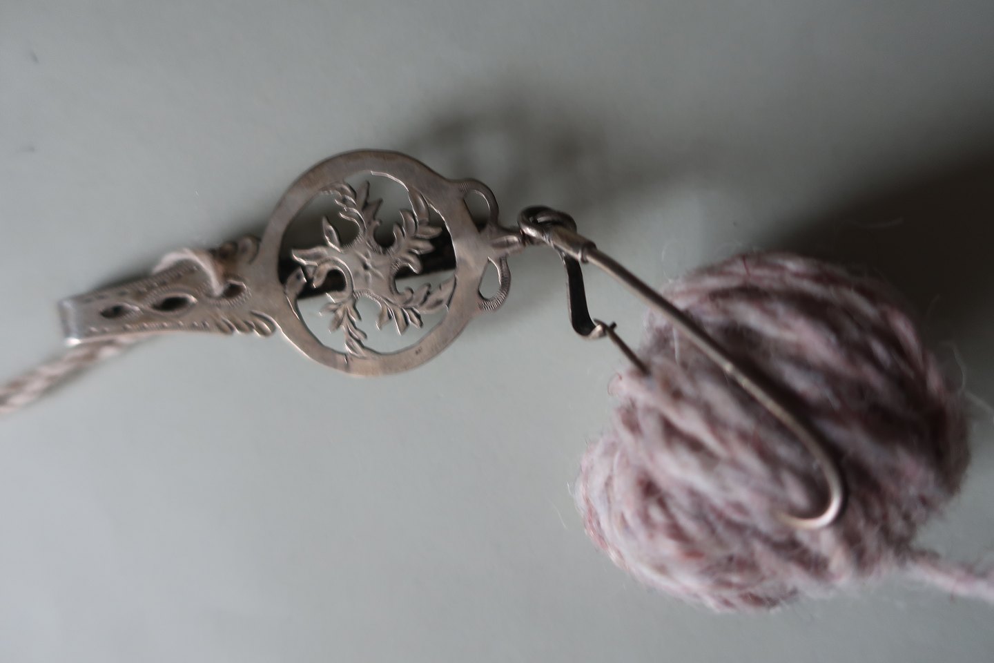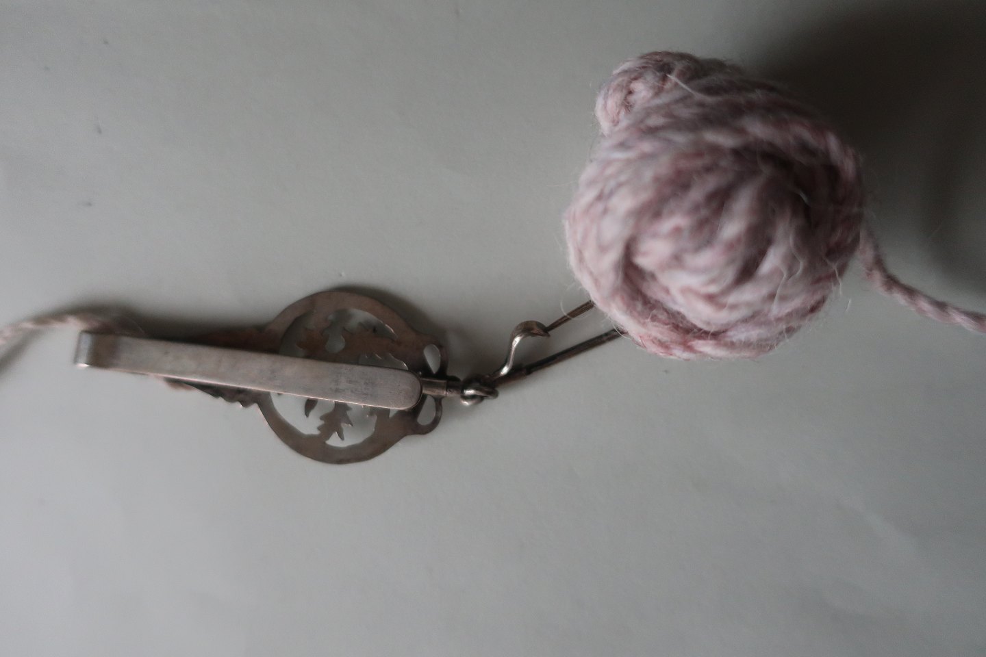 Garnet sættes derefter fast i giljekrogen, og det var dermed muligt at gå omkring og strikke, uden at skulle holde styr på garnnøglet