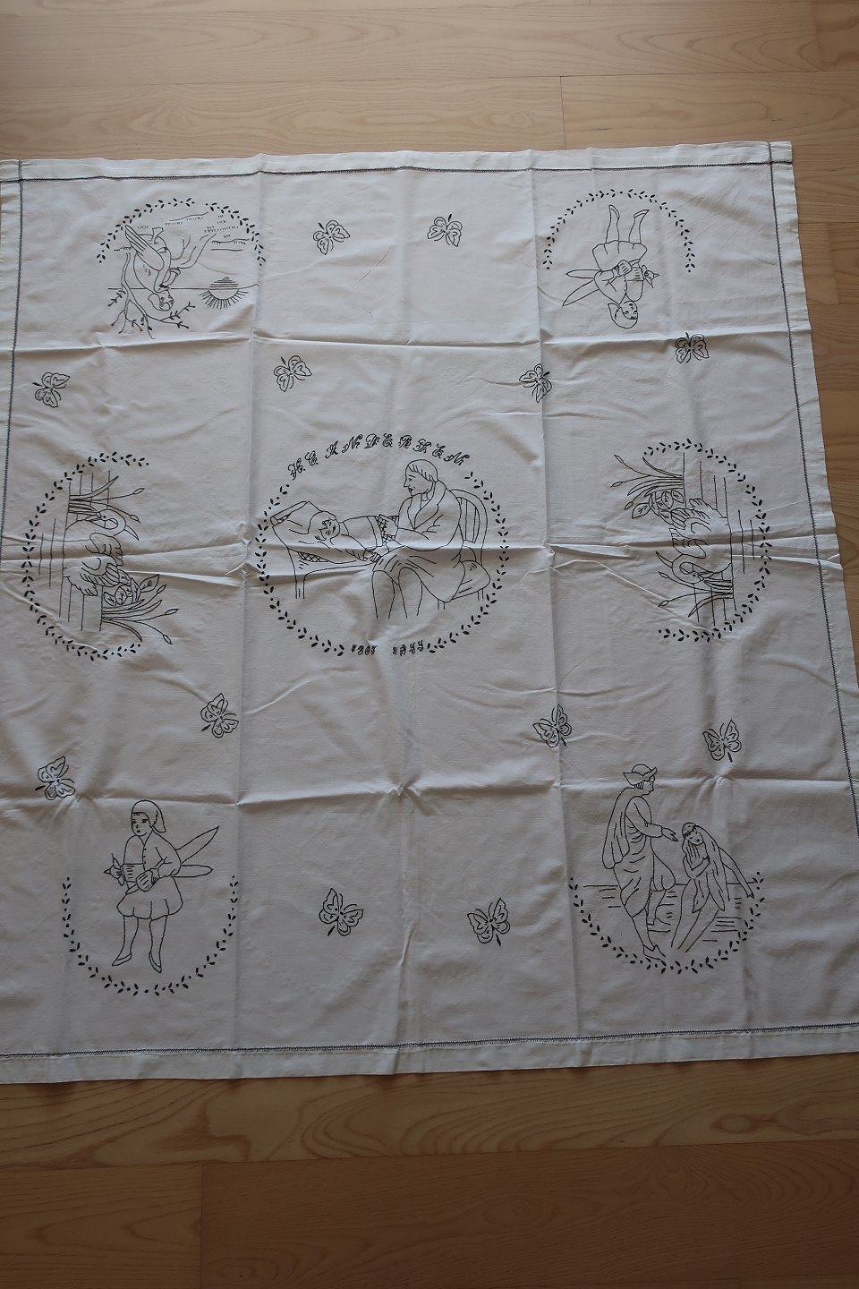 Gammel dug H. C. Andersen motiver Håndbroderet med farvet broderi Tekst "Mor 1956" Ca. 127cm x 114cm God stand Varenr.: DG106-4-51131