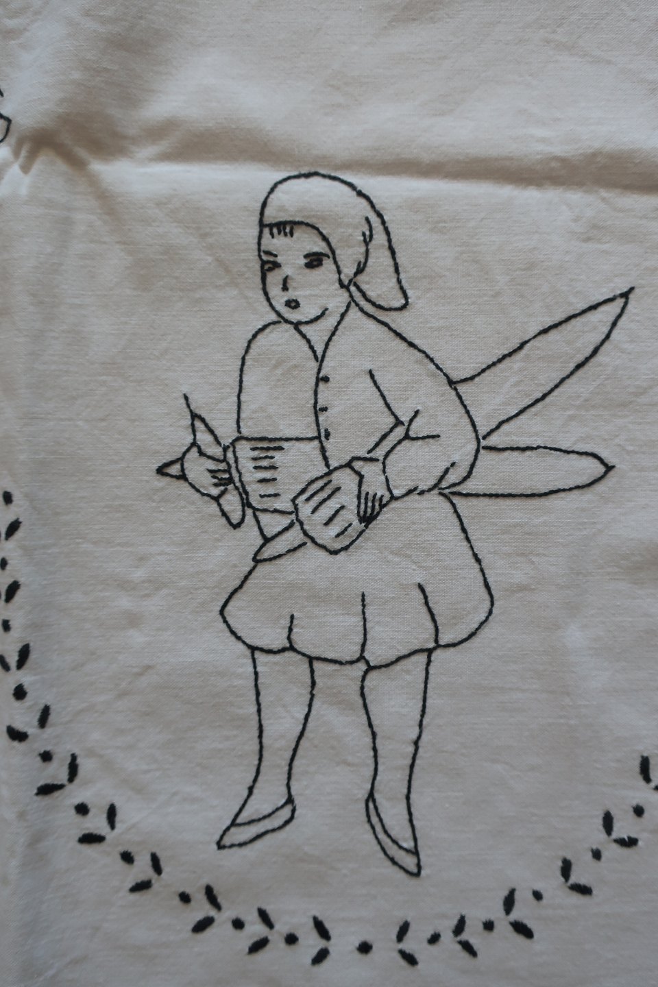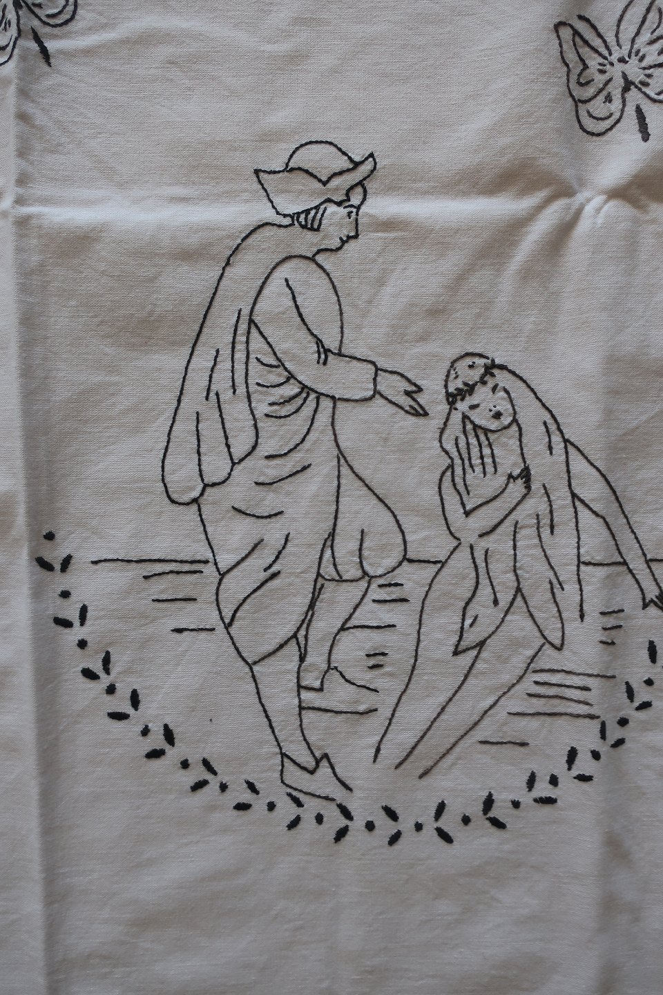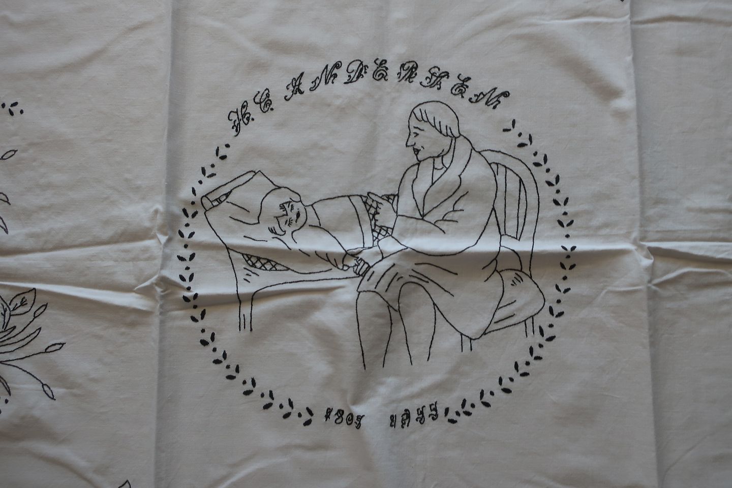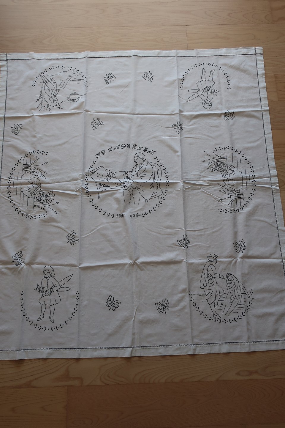 Gammel dug H. C. Andersen motiver Håndbroderet med farvet broderi Tekst "Mor 1956" Ca. 127cm x 114cm God stand Varenr.: DG106-4-51131
