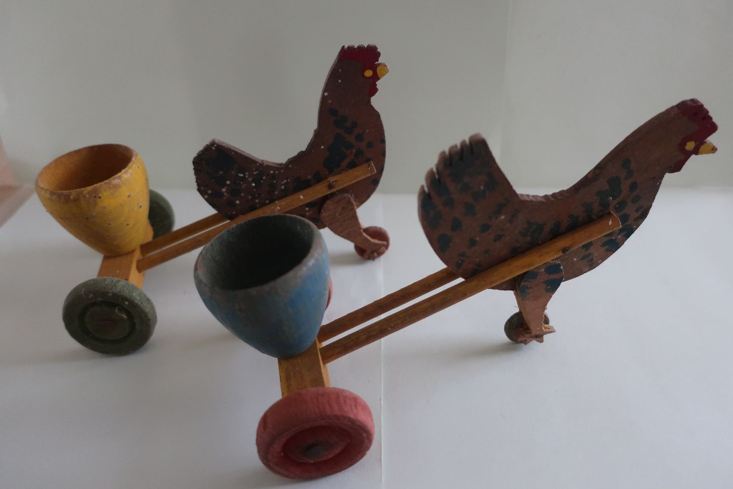 2 stk. gamle/antikke høner, hver med en trækvogn med æggebæger.