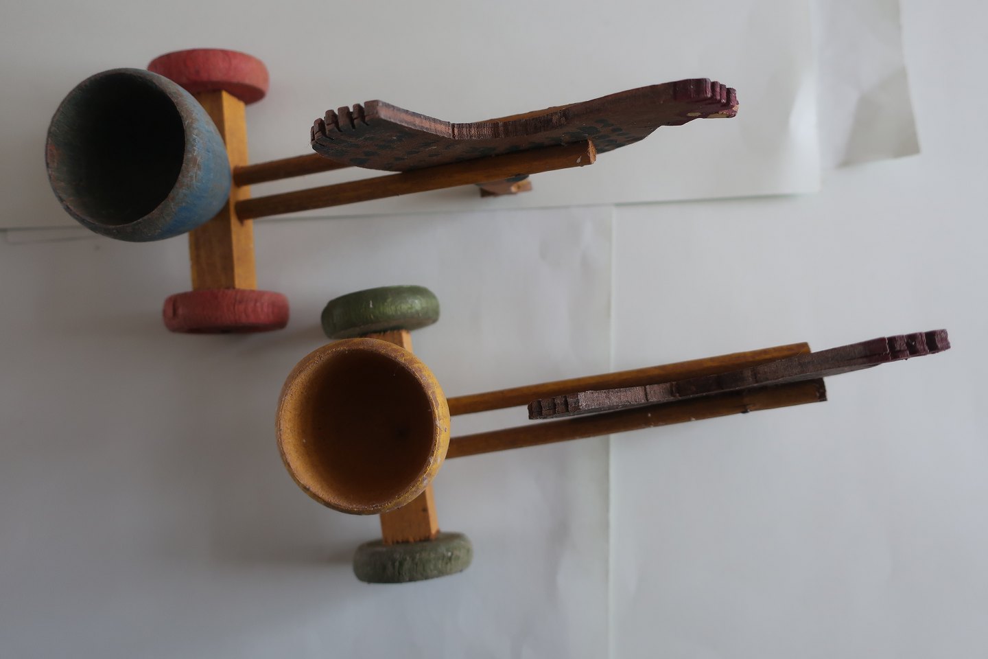 De er lavet i træ - Og de er håndlavede, - måske fængselslegetøj/fængselsarbejde